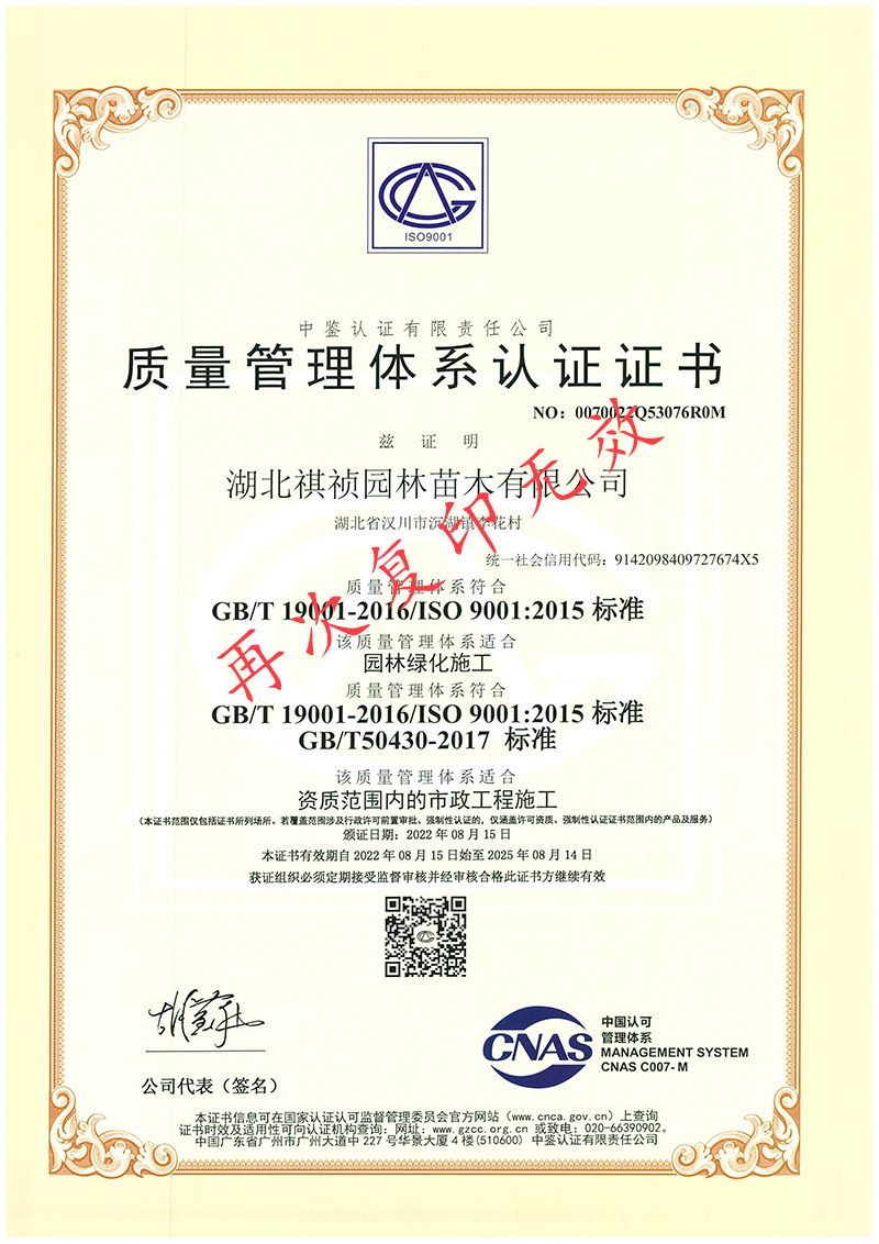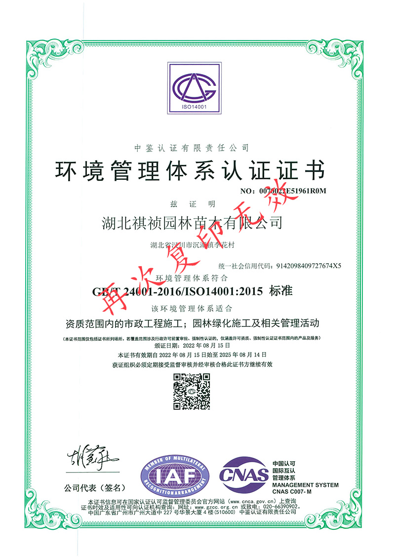湖北祺禎園林苗木有限公司是一家專門致力于發展現代林業、苗圃花卉、旅游觀光、休閑娛樂、園林市政環保工程建設于一體的湖北省林業產業化省級龍頭企業,公司具備城市園林綠化、建筑工程施工總承包、市政公用工程施工總承包、機電工程施工總承包、城市及道路照明工程專業承包、環保工程專業承包、施工勞務資質不分等級等多項建筑業企業資質,先后獲得湖北省林業產業化省級重點龍頭企業、AAA級信用等級企業、孝感市“守合同重信用榮譽證書”、“五一勞動獎”等榮譽及質量管理、環境管理、職業健康安全管理三大體系認證。
